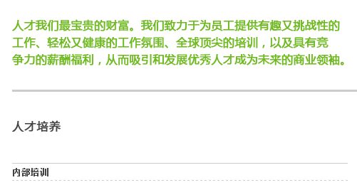 富惟公司是當(dāng)今為數(shù)不多的采用內(nèi)部提升制的企業(yè)之一。內(nèi)部提升制已經(jīng)成為富惟企業(yè)文化的顯著表現(xiàn)形式之一,是富惟用人制度的核心,也是富惟取得競(jìng)爭(zhēng)優(yōu)勢(shì)的一個(gè)重要源泉。隨著富惟公司的成長(zhǎng)而一道成長(zhǎng)的員工的自豪感和主人翁意識(shí)保持了公司的凝聚力。